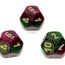 Gemini Polyhedral Green-Purple/gold d12 ~ Multiple loose dice are pictured to show all sides and possible color variations. Item Code is for individual dice.