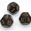 Opaque Polyhedral Black/gold d12 ~ Multiple loose dice are pictured to show all sides and possible color variations. Item Code is for individual dice.