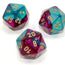 Gemini Polyhedral Purple-Teal/gold d20 ~ Multiple loose dice are pictured to show all sides and possible color variations. Item Code is for individual dice.