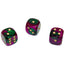 Gemini 12mm w/pips Green-Purple/gold d6 ~ Multiple loose dice are pictured to show all sides and possible color variations. Item Code is for individual dice.