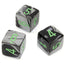 Gemini Polyhedral Black-Grey/green d6 w/#s ~ Multiple loose dice are pictured to show all sides and possible color variations. Item Code is for individual dice.