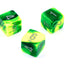 Gemini Polyhedral Green-Yellow/silver d6 w/#'s ~ Multiple loose dice are pictured to show all sides and possible color variations. Item Code is for individual dice.
