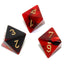 Gemini Polyhedral Black-Red/gold d8 ~ Multiple loose dice are pictured to show all sides and possible color variations. Item Code is for individual dice.