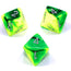 Gemini Polyhedral Green-Yellow/silver d8 ~ Multiple loose dice are pictured to show all sides and possible color variations. Item Code is for individual dice.