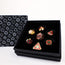 The dice comes in a giftable box with a unique design, with foam divets to keep the dice secure and safe.