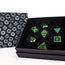 The dice comes in a giftable box with a unique design, with foam divets to keep the dice secure and safe.
